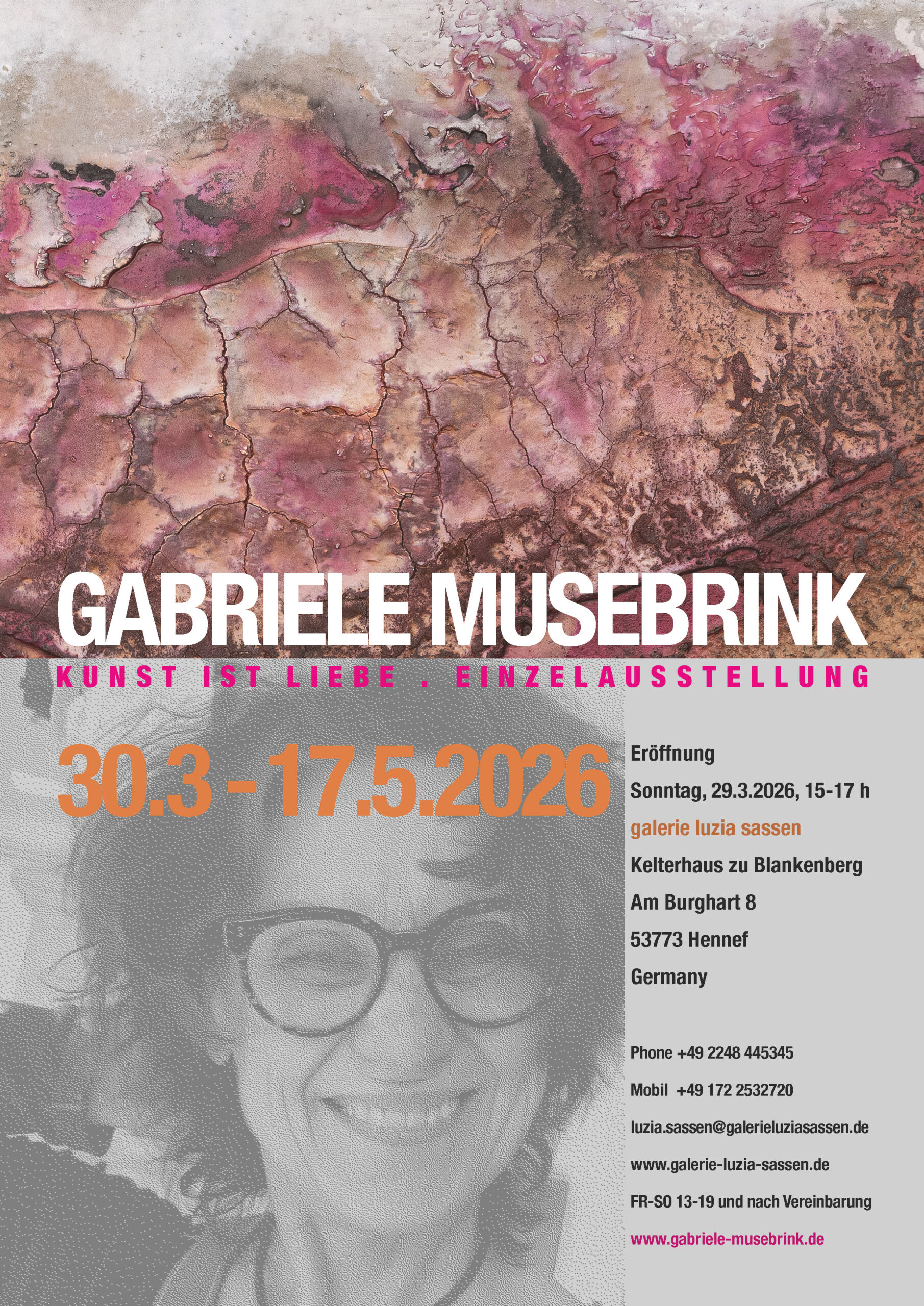 Die „galerie luzia sassen“ zeigt aktuelle Werke der Künstlerin Gabriele Musebrink. Die Ausstellung mit dem Titel „Kunst ist Liebe“ wird am Sonntag, 29. März 2026, von 15 bis 17 Uhr eröffnet und ist anschließend bis zum 17. Mai 2026 im herzoglichen Kelterhaus zu...